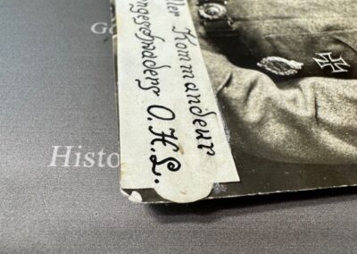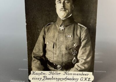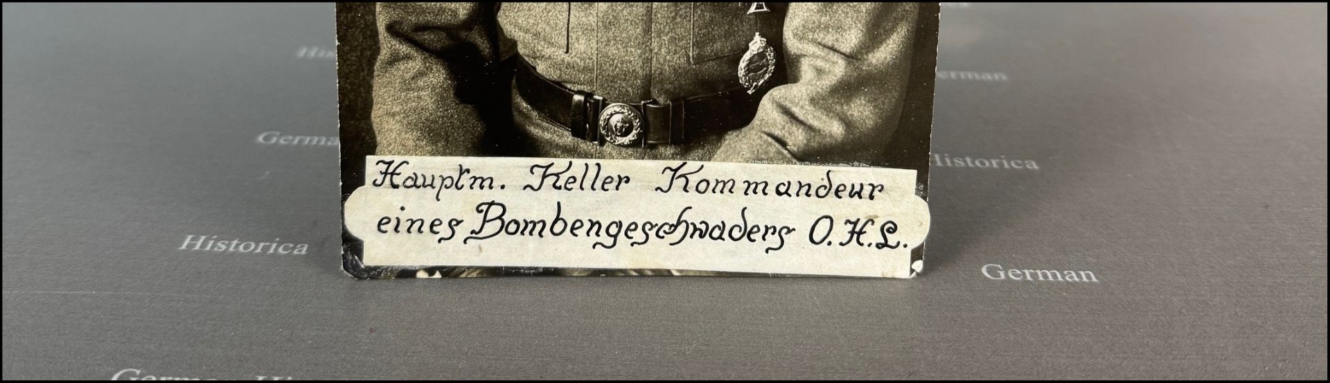 Originalfoto aus dem Privatbesitz von Hauptmann Alfred Keller (Pour le Mérite, EK I) mit aufgeklebt beschriftetem Papierschildchen („Hauptm. Keller – Kommandeur eines Bombengeschwaders O.H.L.“). Dieses Stück wurde als Druckvorlage für Postkarten aufbereitet und auch in zeitgenössischen Zeitungsberichten genutzt. Damit handelt es sich nicht um eine einfache Aufnahme, sondern um ein seltenes Arbeitsfoto aus der propagandistischen Verwertung.