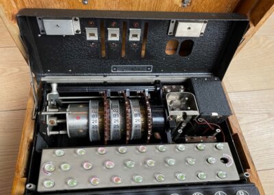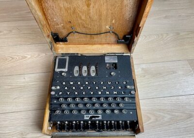 Wir präsentieren hier eine äußerst seltene, originale Enigma M3 der deutschen Kriegsmarine, komplett mit originaler Transportkiste. Dieses historische Chiffriergerät wurde ab 1940 auf Kriegsschiffen und U-Booten eingesetzt und zählt heute zu den begehrtesten und am schwersten zu findenden militärhistorischen Originalstücken.