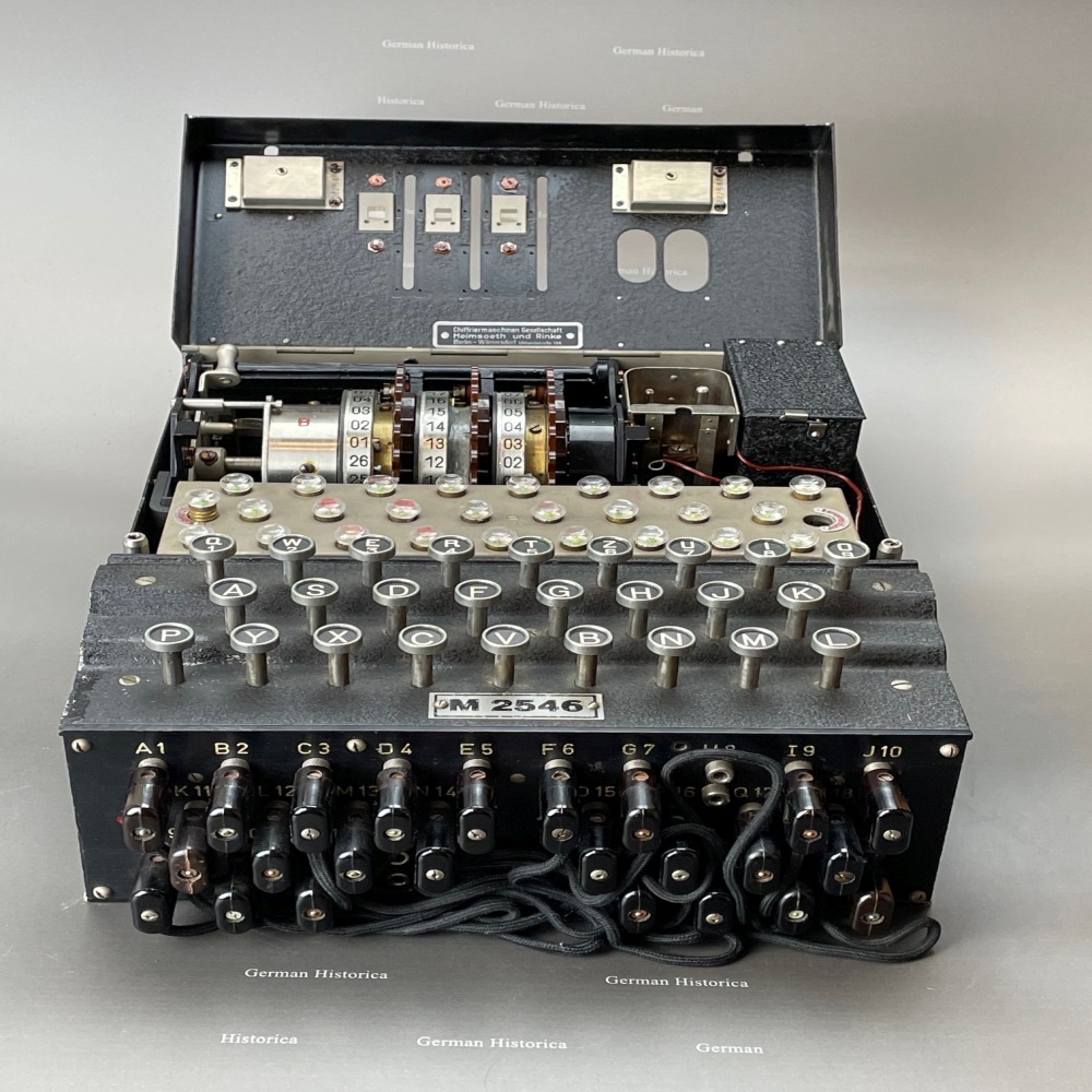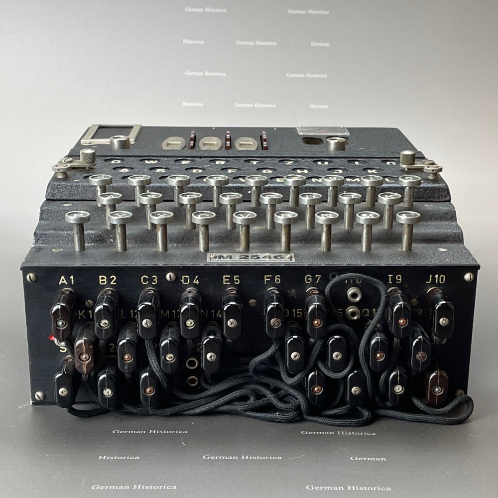 Wir präsentieren hier eine äußerst seltene, originale Enigma M3 der deutschen Kriegsmarine, komplett mit originaler Transportkiste. Dieses historische Chiffriergerät wurde ab 1940 auf Kriegsschiffen und U-Booten eingesetzt und zählt heute zu den begehrtesten und am schwersten zu findenden militärhistorischen Originalstücken.