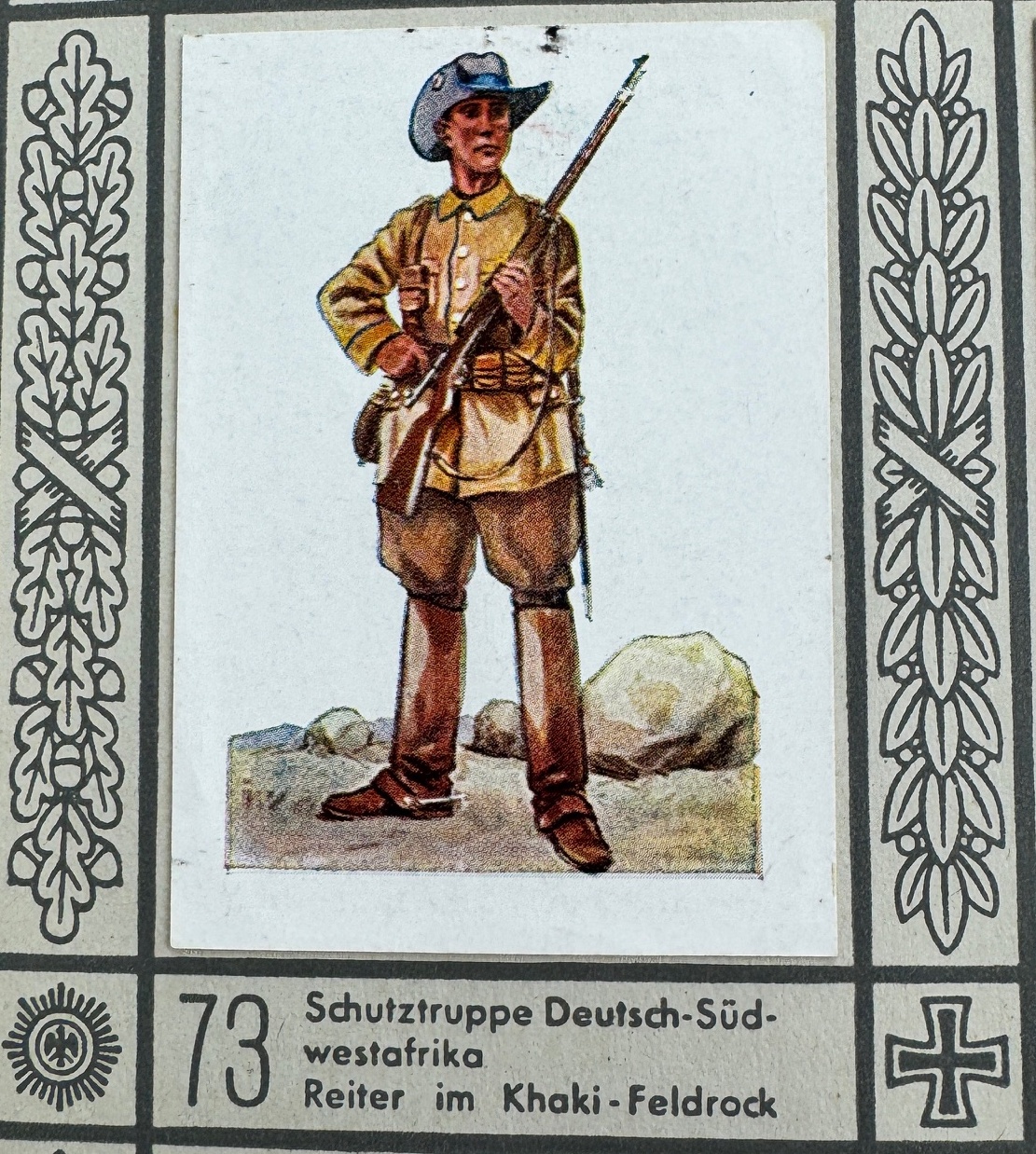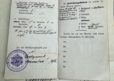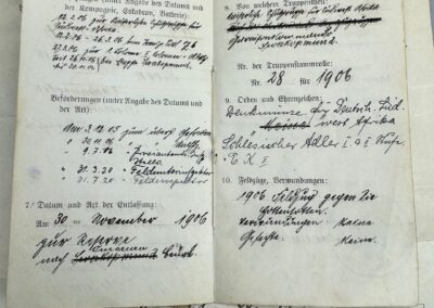 Bei den erhaltenen Schriftstücken handelt es sich um einen Militärpass, ein Führungszeugnis sowie ergänzende Personalunterlagen. Sie dokumentieren den aktiven Dienst eines Angehörigen der Kaiserlichen Schutztruppe, der nachweislich von Februar 1906 bis November 1906 in Deutsch-Südwestafrika eingesetzt war. Das Führungszeugnis wurde am 30. November 1906 in Swakopmund ausgestellt und bestätigt das Ende des aktiven Dienstes.
