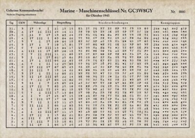 Wir zeigen hier auch ein Marine-Maschinenschlüssel-Blatt. Darauf wurden die täglichen Vorgaben festgelegt – also, welche Umkehrwalze (UKW), welche Walzenkombination, welche Ringstellungen und welche Steckerverbindungen zu verwenden waren.