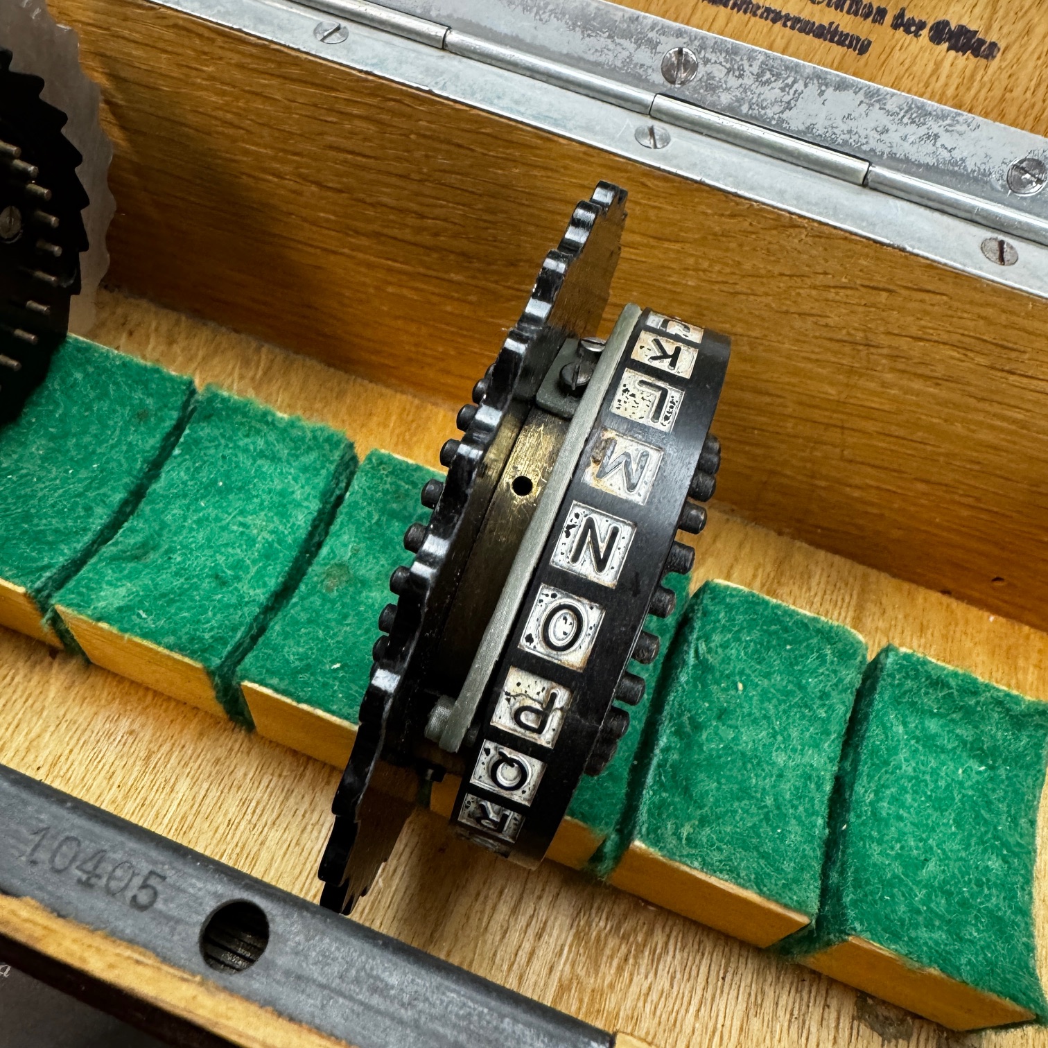 Im Inneren befinden sich acht grün befilzte Steckplätze, passend zu den Rotoren der Enigma. Die Polsterung schützte die Kontaktflächen und Ringe der Walzen vor Beschädigung und dämpfte Stöße beim Transport.