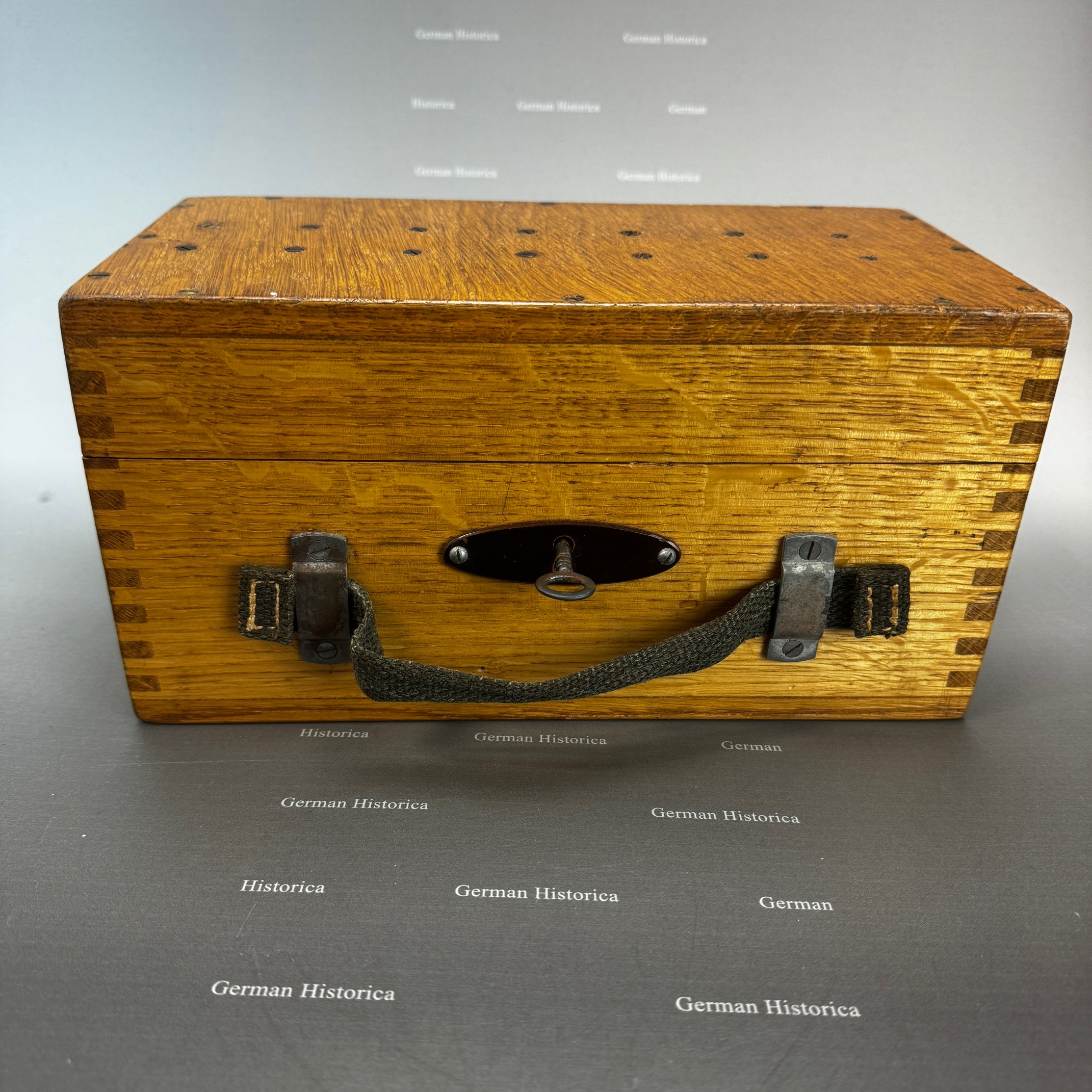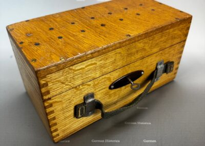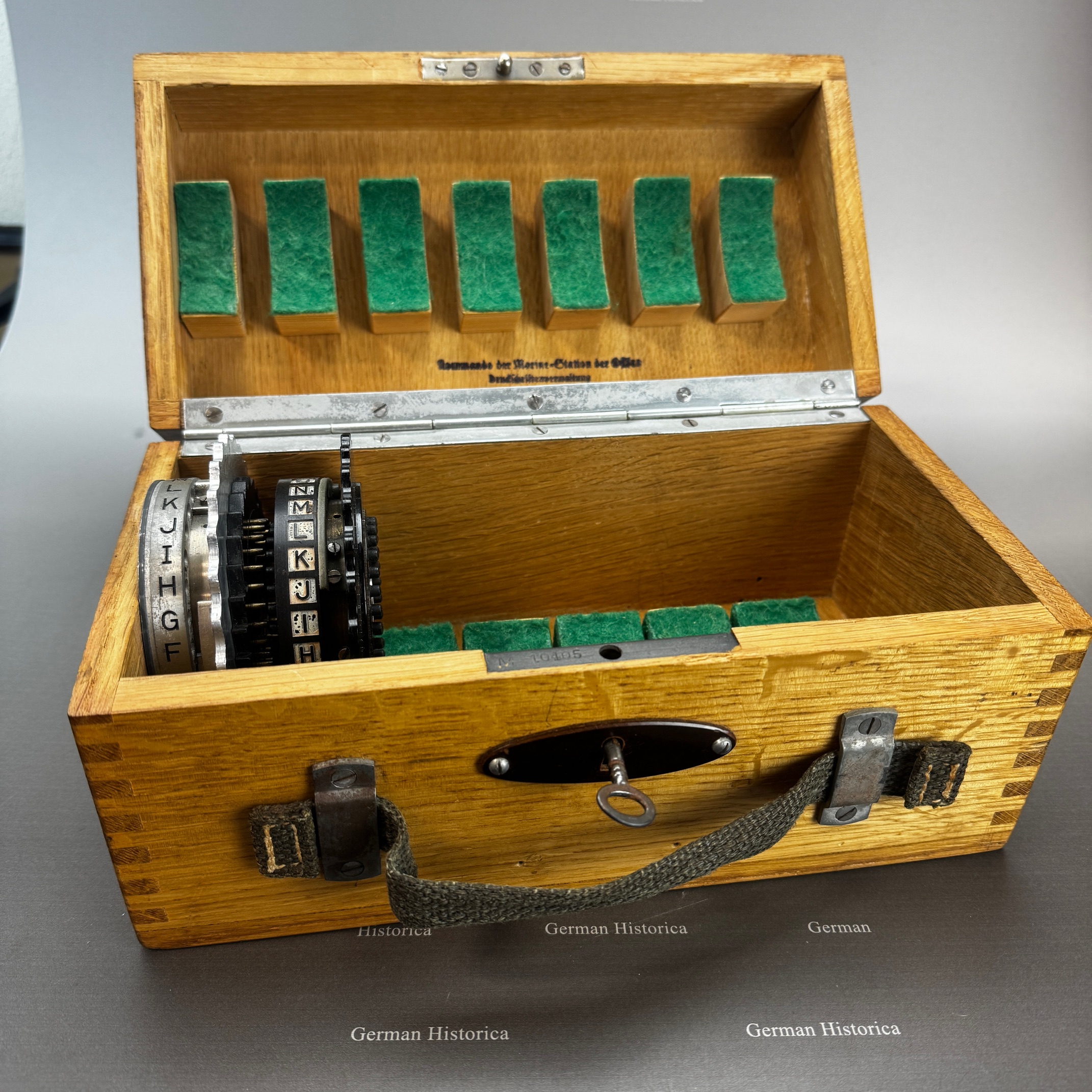 Der auf der Innenseite des Deckels angebrachte Stempel „Kommando der Marine-Station der Ostsee / Druckschriftenverwaltung“ weist auf eine Ausgabe über die Marineleitung Kiel hin. Solche Boxen befanden sich auf U-Booten und in Küstenfunkstellen, wo regelmäßig Walzen getauscht und Schlüssel geändert wurden.