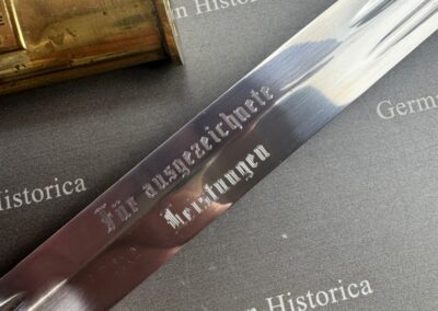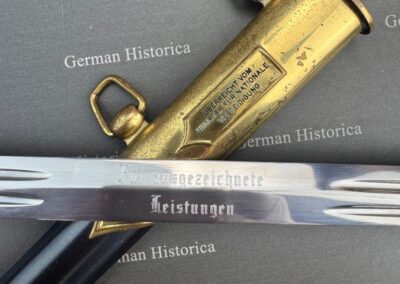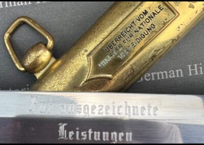 Standard-Widmung: „Überreicht vom Minister für Nationale Verteidigung“. Sie kennzeichnet den Dolch als offizielles Präsent.