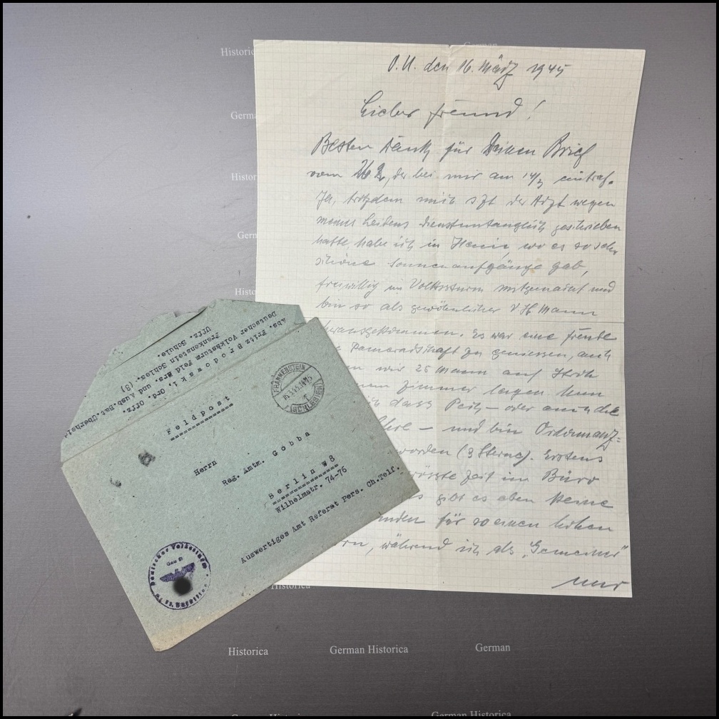 Brief und Umschlag sind damit weit mehr als Sammlerstücke. Sie zeigen, wie sich der Volkssturm in der Praxis darstellte: Männer zwischen 16 und 60, unter Führung lokaler Offiziere, mit dürftiger Bewaffnung und kaum Chancen gegen die Rote Armee. Sie zeigen auch, wie selbst im März 1945 noch versucht wurde, Normalität zu wahren – und wie Hoffnung und Verdrängung nebeneinander bestanden. Nur wenige Tage nach diesem Schreiben fiel Frankenstein an die Rote Armee. Der Brief ist damit ein letzter Gruß aus einer Welt, die im Zusammenbruch begriffen war.