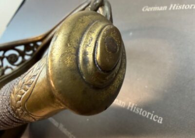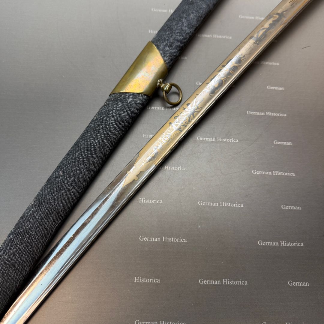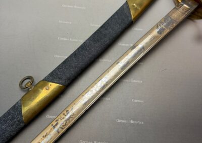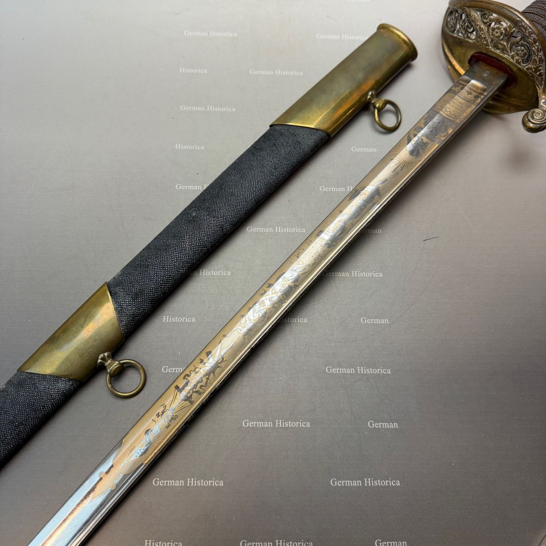 Die Kombination aus dem vorgeschriebenen Army-Gefäß und einer prunkvoll ausgeführten, maritim gekennzeichneten Klinge mit der Markierung „USN“ weist auf eine private Beschaffung in gehobener Ausführung hin. Maritime Ätzungen dienten dabei der Identitätswahrung und der Tradition innerhalb dieser vorgegebenen Army-Konfiguration.