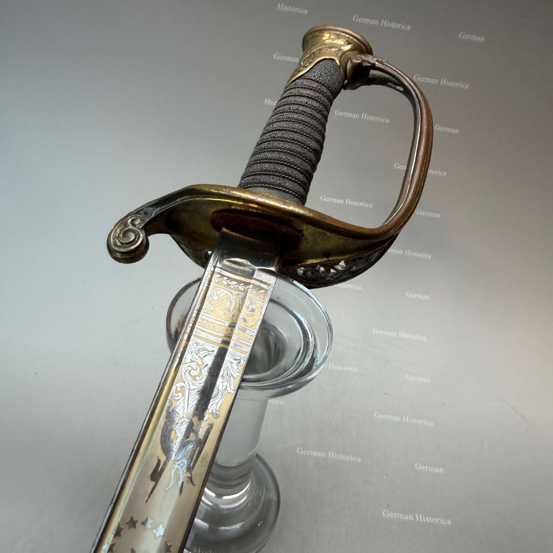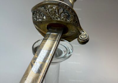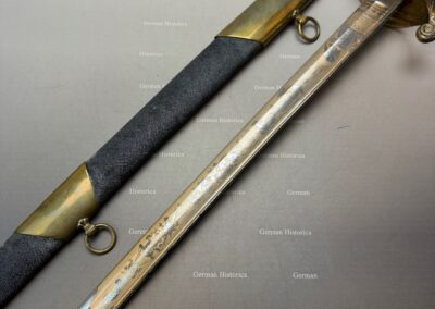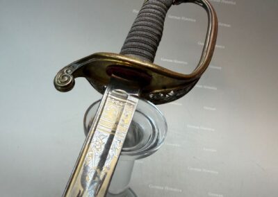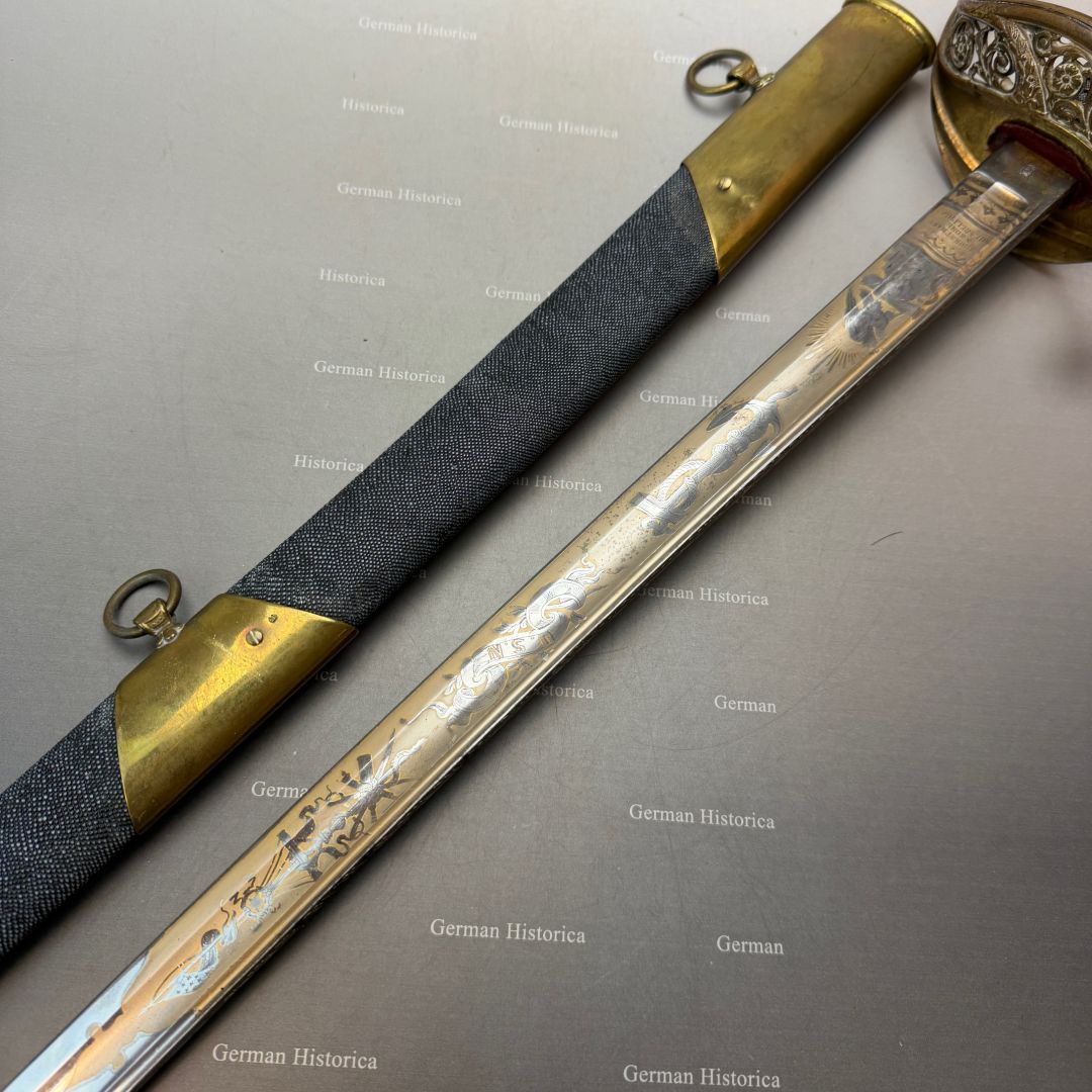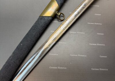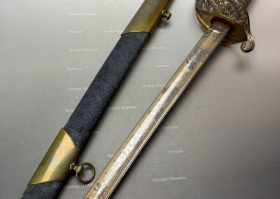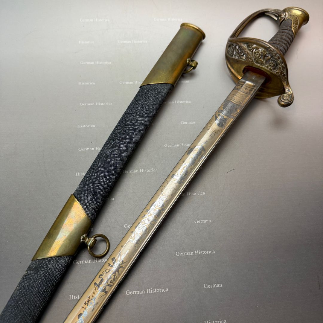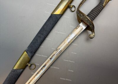 Vergleichsstücke dieser Hybrid-Konfiguration – Foot-Officer-Gefäß in Verbindung mit maritim geprägten Klingen – sind im National Museum of the Marine Corps sowie im Smithsonian dokumentiert. Die erhaltene Goldätzung und die seltene Rochenhaut-Scheide ordnen das Stück in den Bereich repräsentativer Offizierswaffen ein.