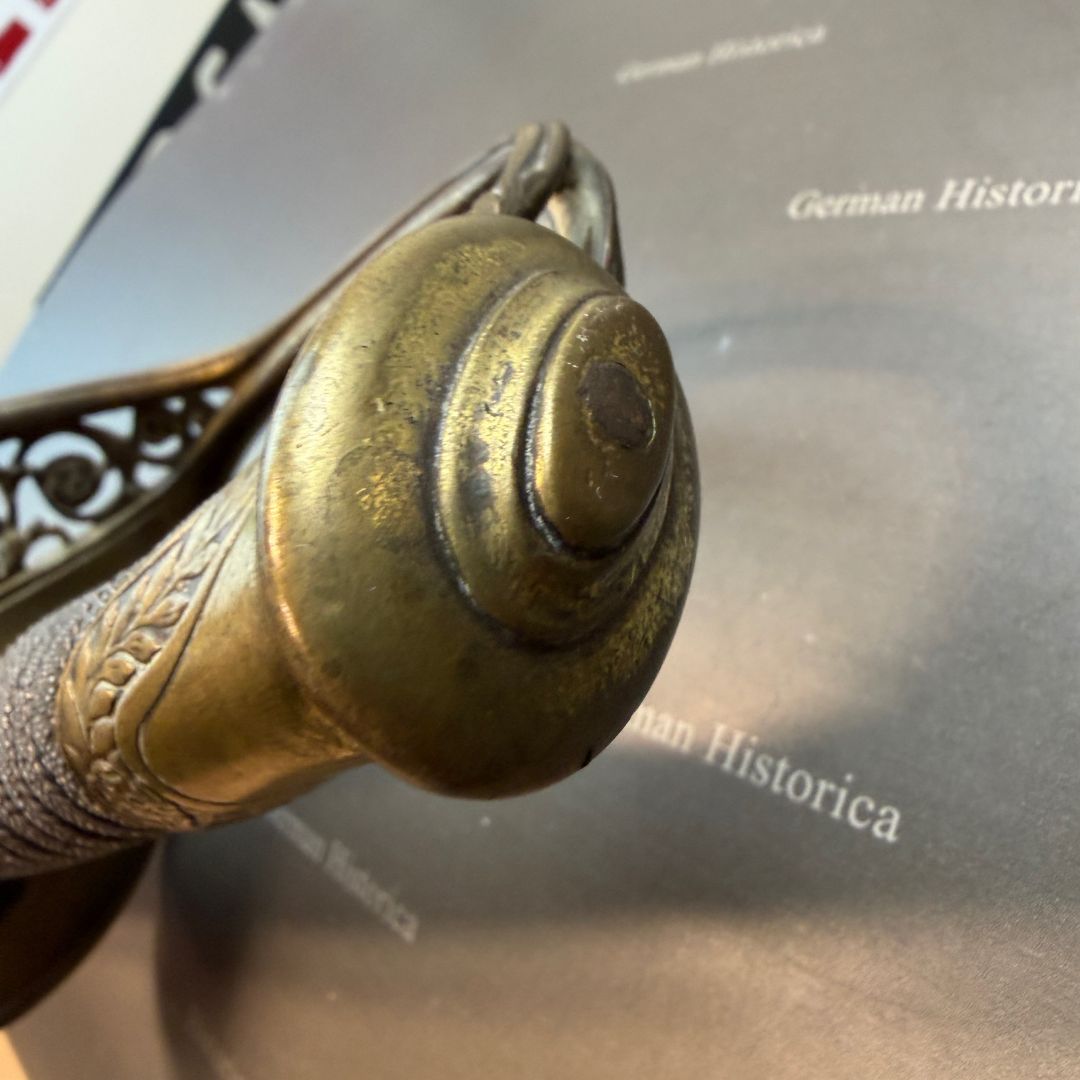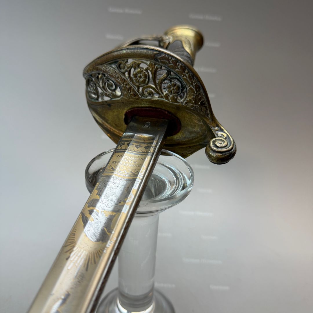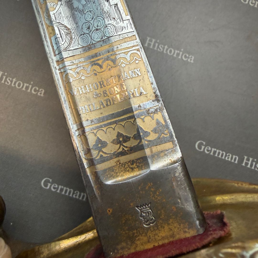 Vergleichsstücke dieser Hybrid-Konfiguration – Foot-Officer-Gefäß in Verbindung mit maritim geprägten Klingen – sind im National Museum of the Marine Corps sowie im Smithsonian dokumentiert. Die erhaltene Goldätzung und die seltene Rochenhaut-Scheide ordnen das Stück in den Bereich repräsentativer Offizierswaffen ein.