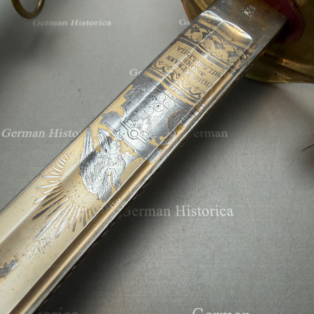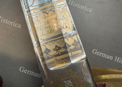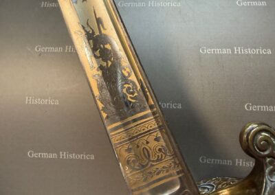 In aufwendiger Goldätzung innerhalb einer Kartusche auf der Klinge ausgeführt.