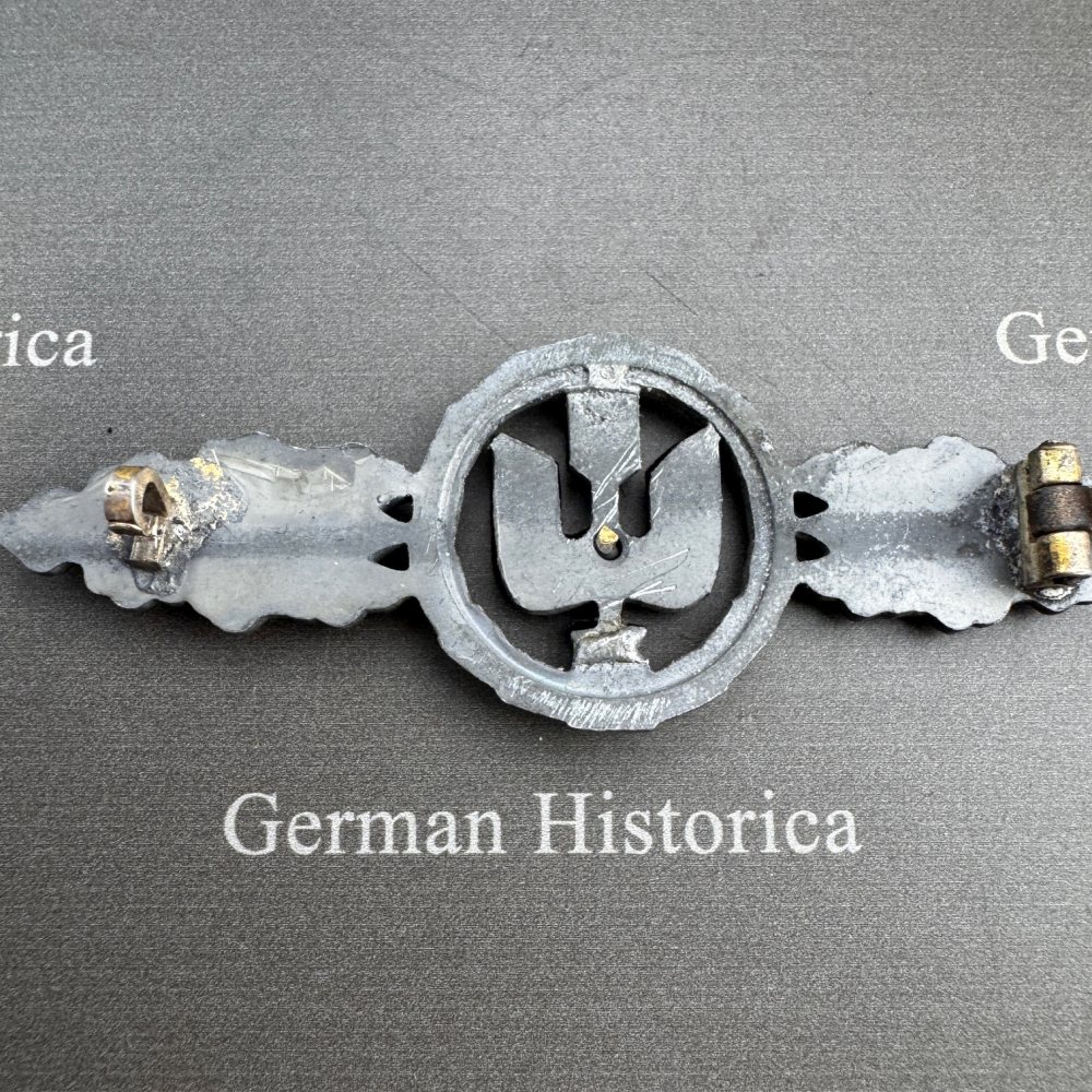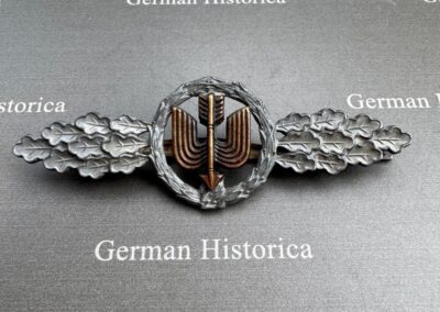 Bei der hier gezeigten Frontflugspange für Zerstörer handelt es sich um eine sehr späte Ausführung mit nach unten zeigendem Pfeil. Konstruktiv basiert sie auf einer normalen Jägerspange, deren Mittelteil werkseitig entnommen, umgedreht und anschließend wieder sauber eingesetzt wurde.