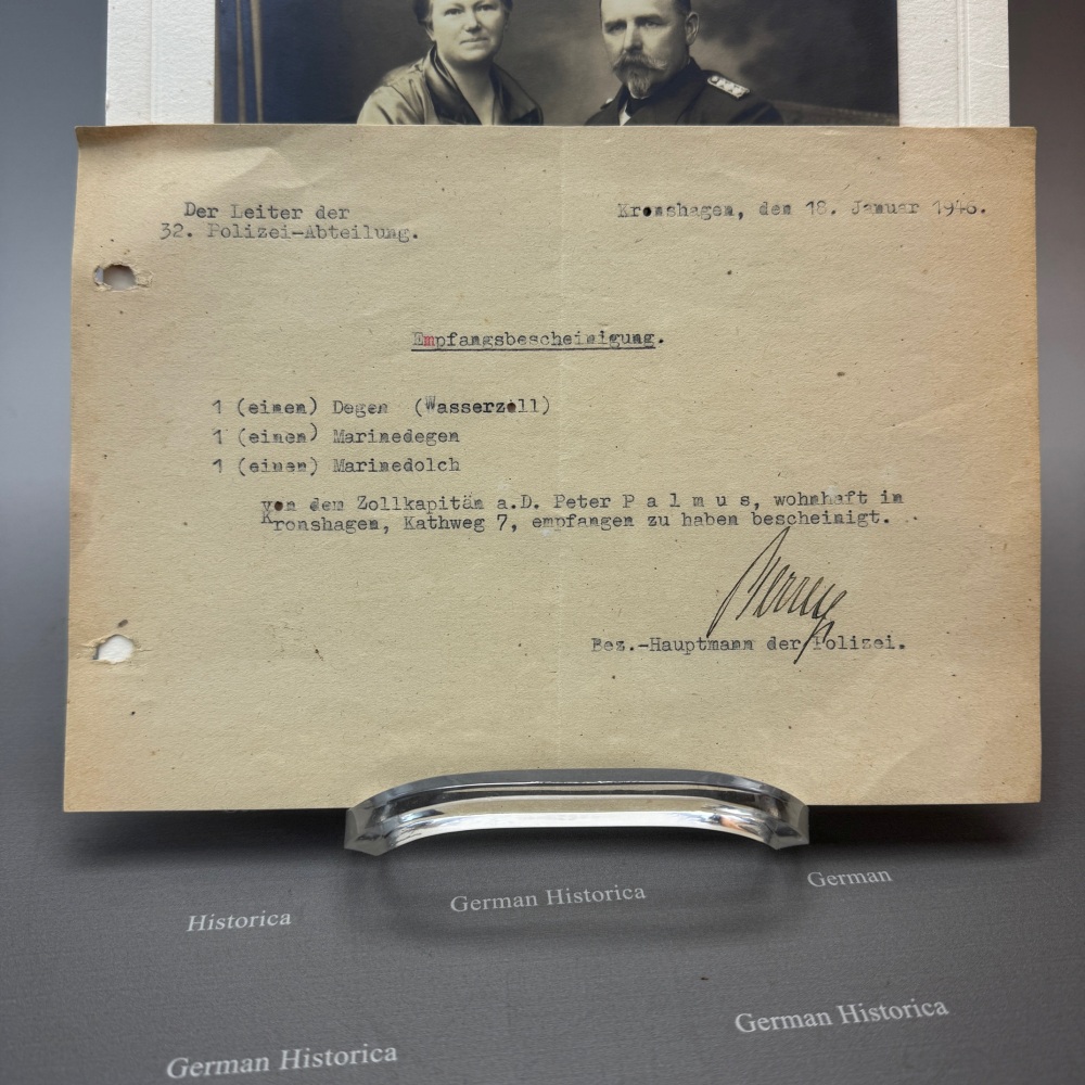 Außergewöhnlich seltene Originalbescheinigung aus dem Jahr 1946 über die Abgabe von Blankwaffen an eine Polizeidienststelle – im konkreten Fall Marinesäbel, Dolch und Degen des Wasserzolls.