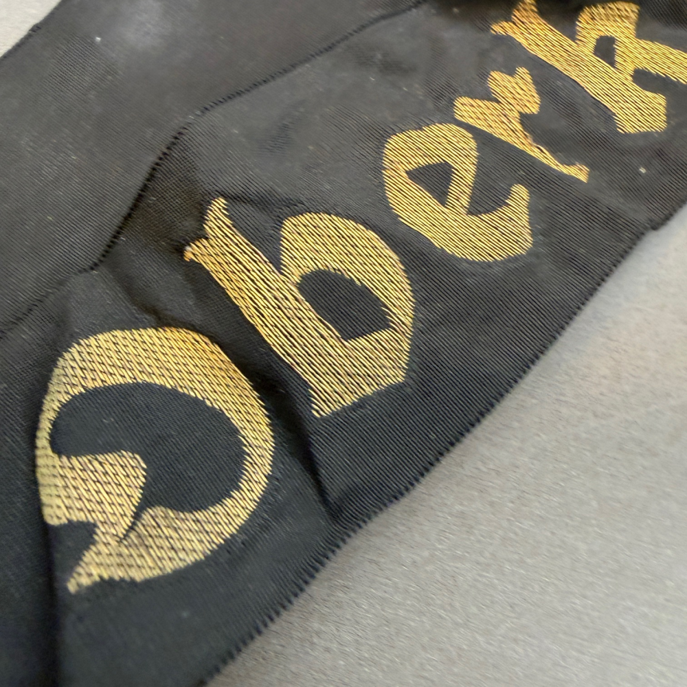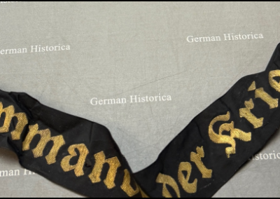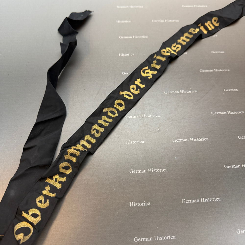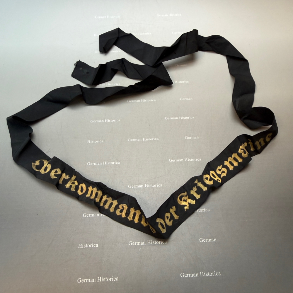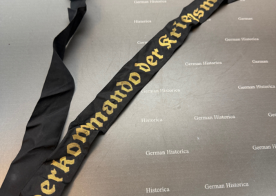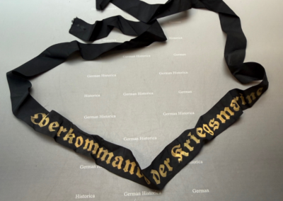 Dieses sehr seltene Mützenband mit der Aufschrift „Oberkommando der Kriegsmarine“ wurde von Mannschaftsdienstgraden des Oberkommando der Kriegsmarine getragen. Der kleine Trägerkreis erklärt die heutige Seltenheit dieses Bandes.