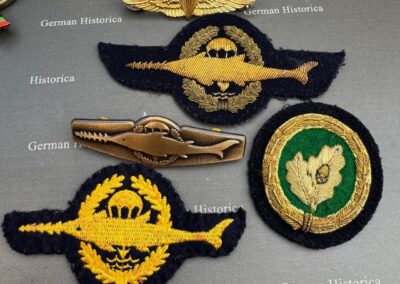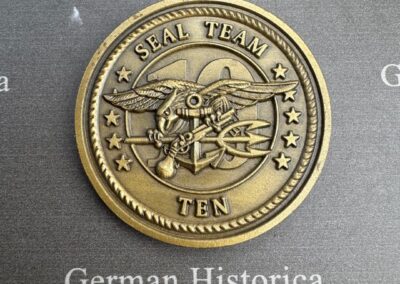 Ergänzt wird das Dokument durch eine umfangreiche Gruppe von Abzeichen und persönlichen Stücken aus dem militärischen Umfeld der Kampfschwimmer. Dazu gehören mehrere Leistungsabzeichen in Stoff- und Metallausführung, ein Einzelkämpferabzeichen, eine US-Fallschirmjägerspange sowie der bekannte Navy-SEAL-Dreizack. Hinzu kommen ein Token des SEAL Team 10, ein Erinnerungsstück „45 Jahre Kampfschwimmerkompanie“ sowie ein DLRG-Abzeichen in Gold.
