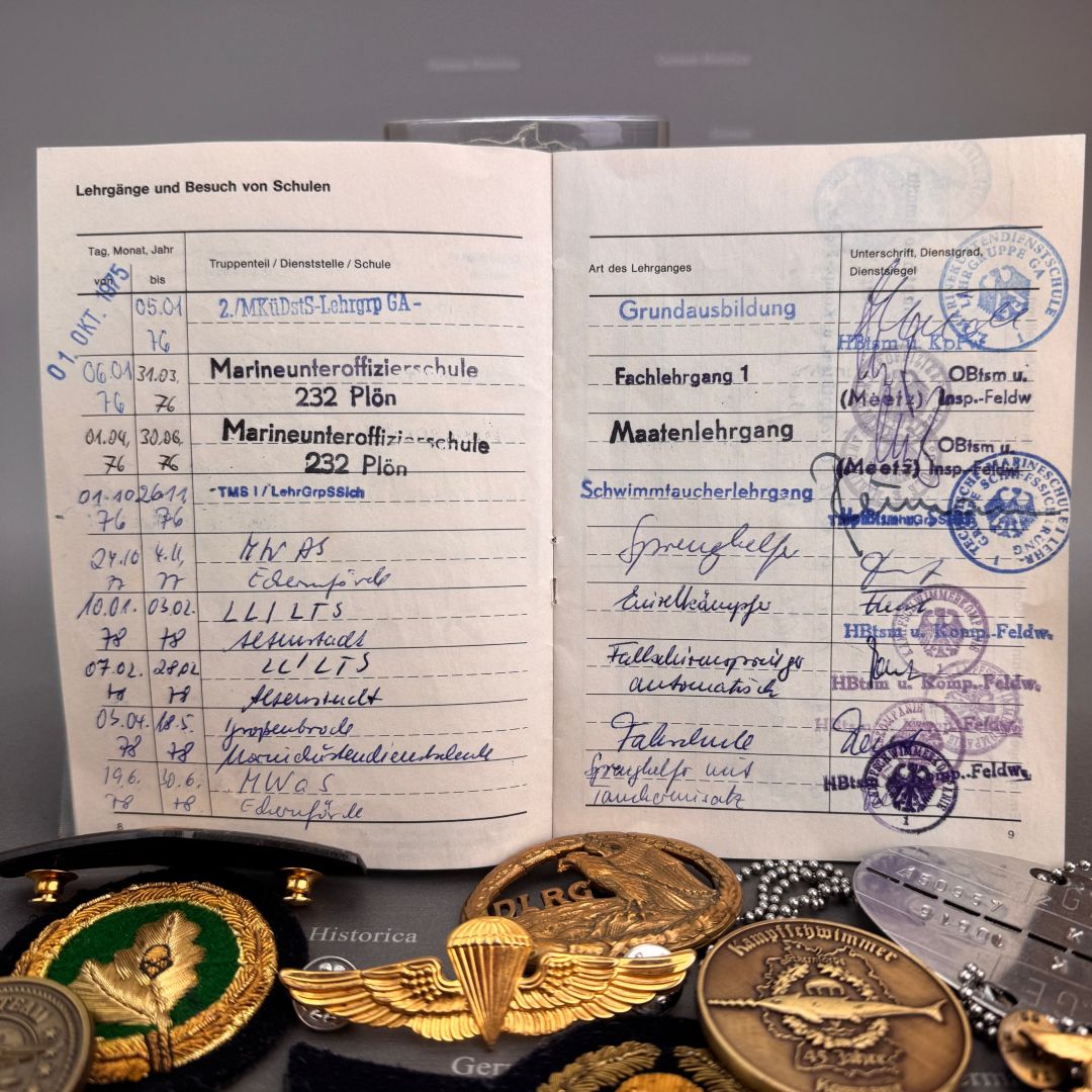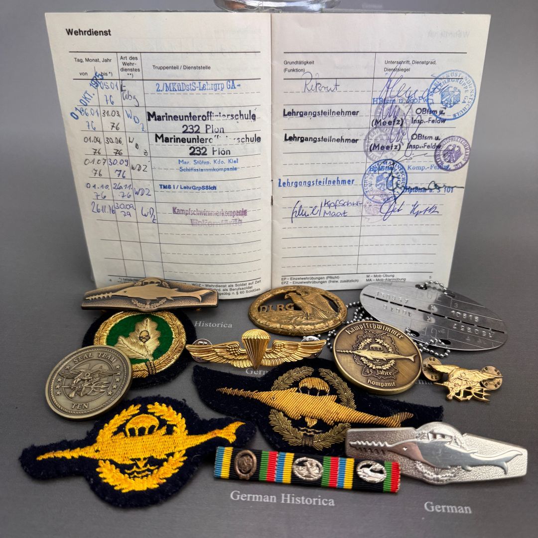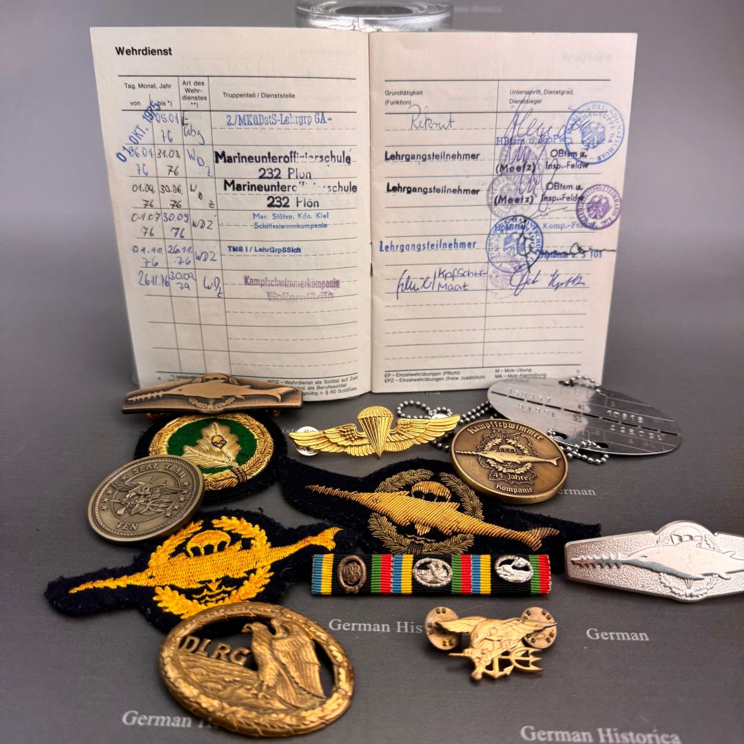 Der vorliegende Nachlass stammt aus dem Besitz eines jungen Kampfschwimmers, der Mitte der 1970er-Jahre in Eckernförde Dienst tat. Im Mittelpunkt steht ein vollständig erhaltener Wehrpass, in dem sämtliche Stationen der Ausbildung und die durchlaufenden Dienststellen lückenlos eingetragen sind. Die Einträge belegen nicht nur die Grundausbildung, sondern auch jene Lehrgänge, die Voraussetzung für die Verwendung als Kampfschwimmer waren: darunter Sprenghelfer, Einzelkämpferausbildung, Fallschirmspringerlehrgang sowie verschiedene Schwimmtaucher- und Spezialausbildungen.