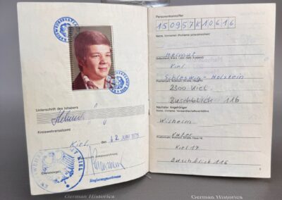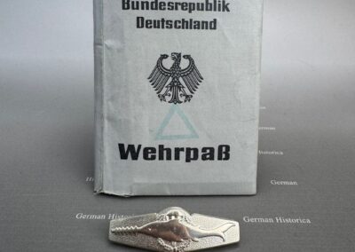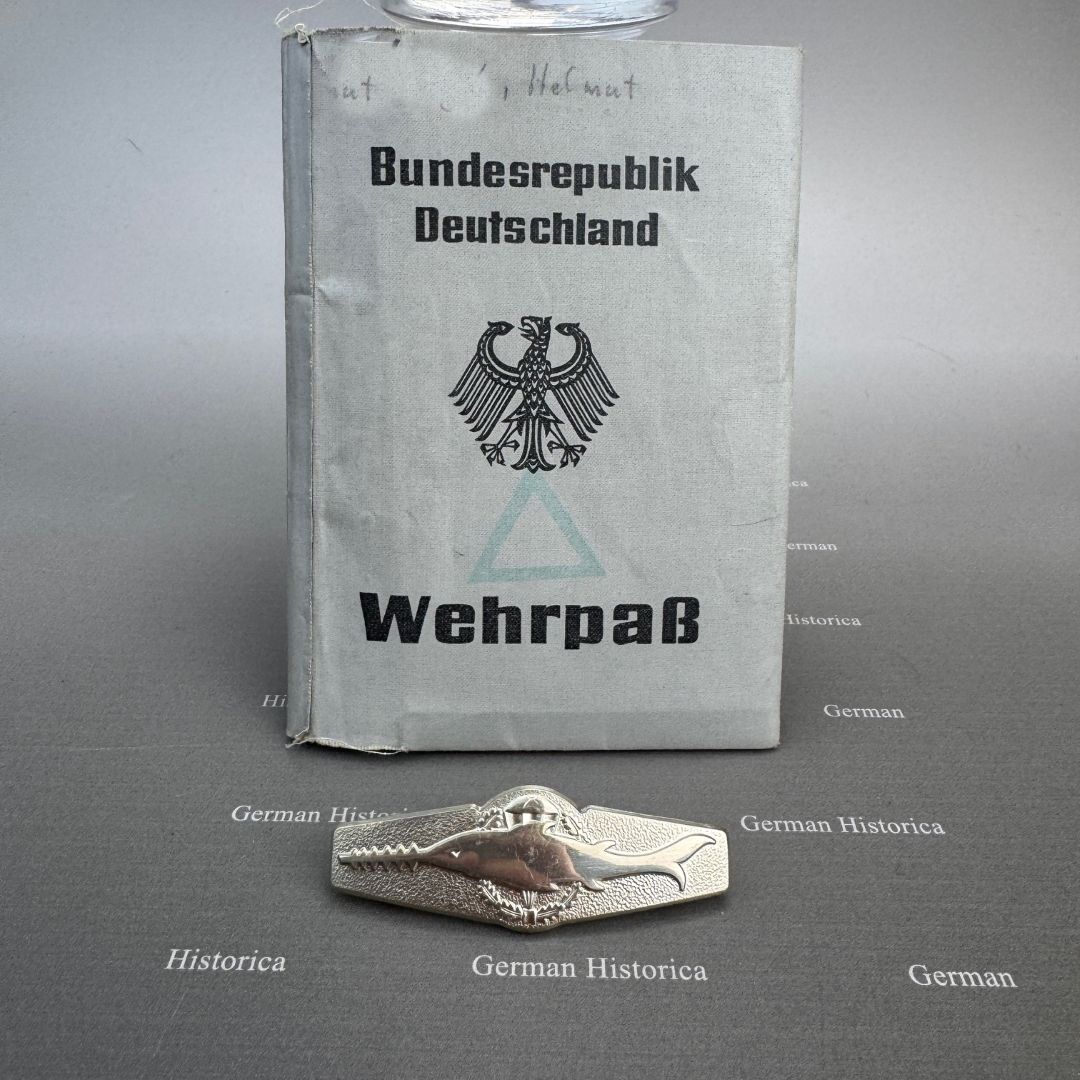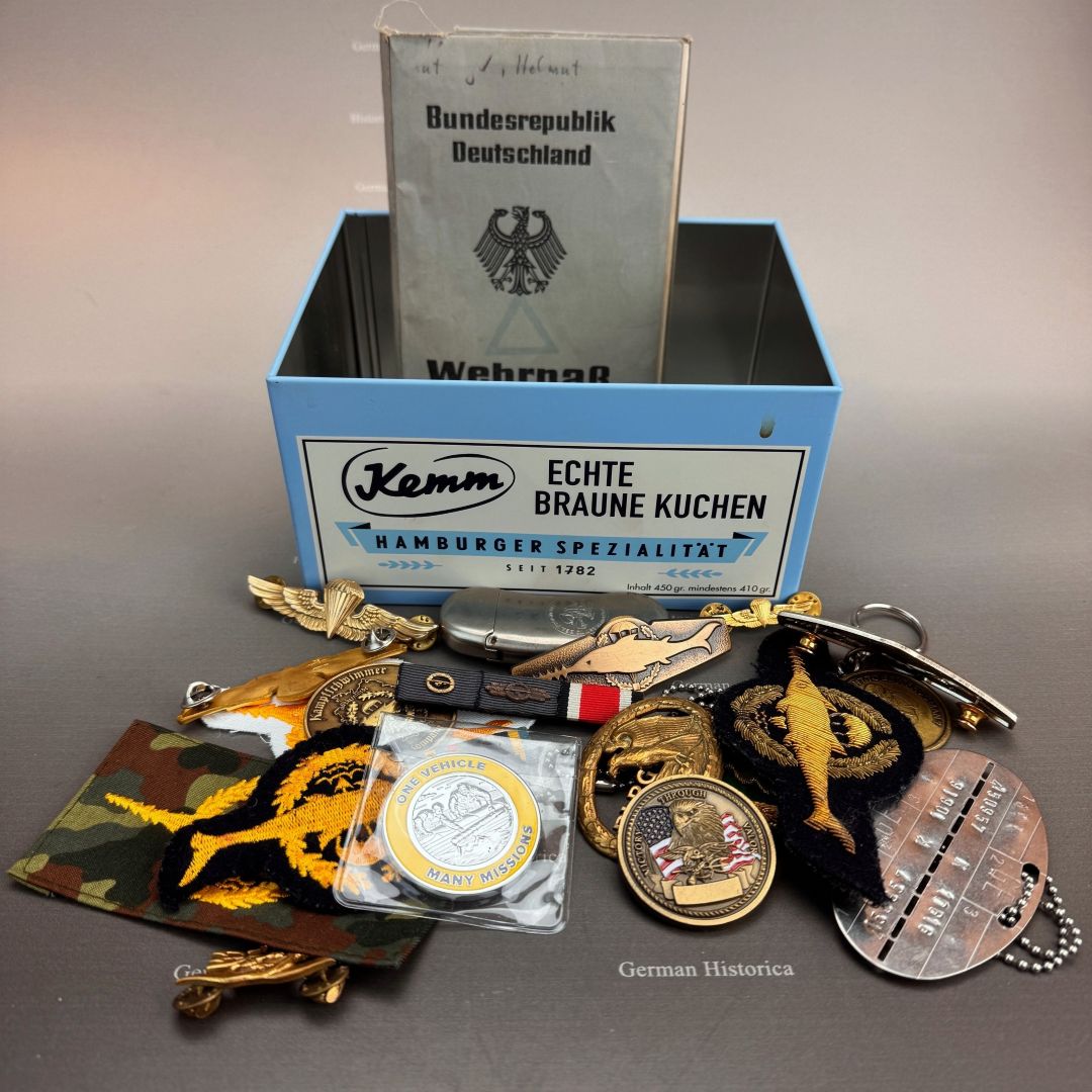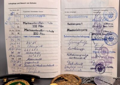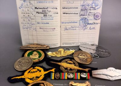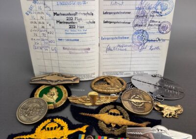 Der vorliegende Nachlass stammt aus dem Besitz eines jungen Kampfschwimmers, der Mitte der 1970er-Jahre in Eckernförde Dienst tat. Im Mittelpunkt steht ein vollständig erhaltener Wehrpass, in dem sämtliche Stationen der Ausbildung und die durchlaufenden Dienststellen lückenlos eingetragen sind. Die Einträge belegen nicht nur die Grundausbildung, sondern auch jene Lehrgänge, die Voraussetzung für die Verwendung als Kampfschwimmer waren: darunter Sprenghelfer, Einzelkämpferausbildung, Fallschirmspringerlehrgang sowie verschiedene Schwimmtaucher- und Spezialausbildungen.