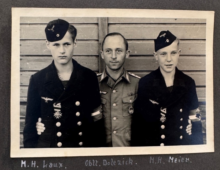 Ein besonders aufschlussreiches Foto des Albums zeigt die namentlich benannte Besatzung der Batterie: Oblt. Dolezick gemeinsam mit den Marinehelfern M.H. Laux und M.H. Meier.