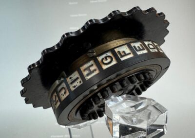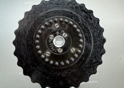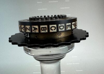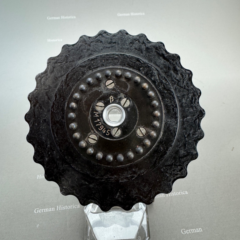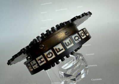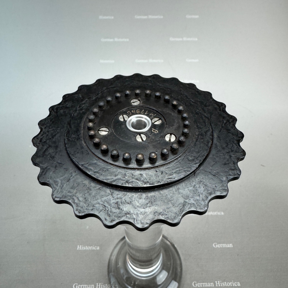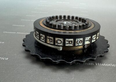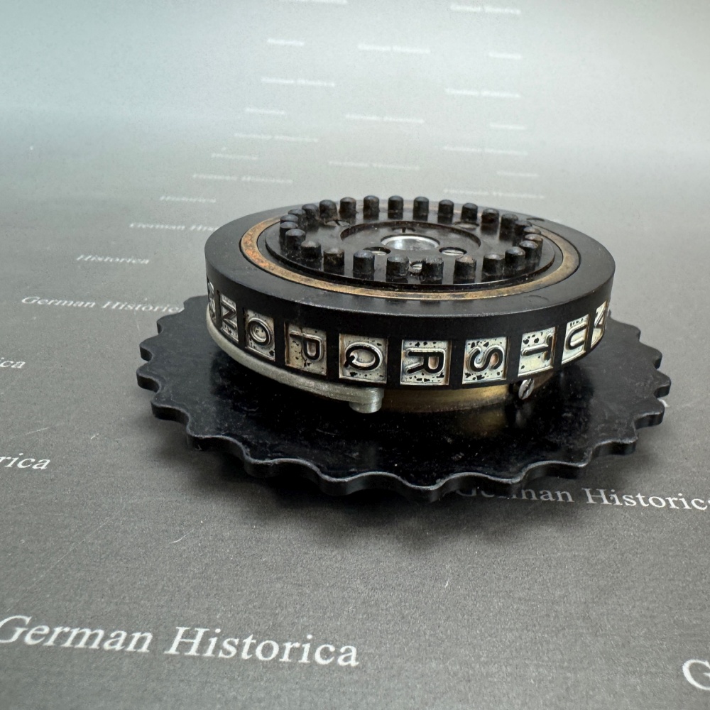 Diese originale Walze stammt aus der Enigma M4 der deutschen Kriegsmarine und befand sich ganz links in der Maschine. Im Gegensatz zu den drei anderen Walzen drehte sie sich nicht automatisch weiter. Sie trug griechische Buchstaben und wurde daher als Griechenwalze bezeichnet. Während Heer und Luftwaffe Ziffern verwendeten, nutzte die Marine umlaufende Buchstaben. Die hier gezeigte späte Ausführung aus schwarzem Bakelit trägt die Seriennummer M 17945