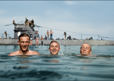 Ein seltener Moment der Unbeschwertheit: Junge U-Boot-Fahrer schwimmen während einer Ausbildungspause in der Ostsee. Im Hintergrund liegt ein U-Boot vom Typ II, ein typisches Ausbildungsboot dieser Zeit, ruhig auf der Wasseroberfläche. Die Szene wirkt gelöst, fast beiläufig – aufgenommen nur wenige Wochen vor Beginn des Zweiten Weltkriegs.