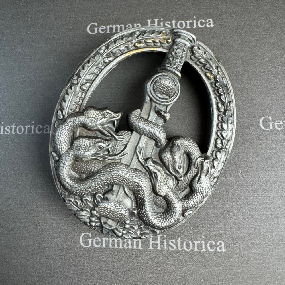 Heute gilt es jedoch als weitgehend gesichert, dass die Varianten mit dem dünnen Nadelsystem und den nicht ausgeschnittenen Schlangen erst nach dem 8. Mai 1945 zusammengestellt wurden. Ob diese Abzeichen auf noch vorhandene Rohlinge zurückgehen oder ob es sich um reine Nachkriegsproduktionen handelt, lässt sich bis heute nicht mit absoluter Sicherheit feststellen.